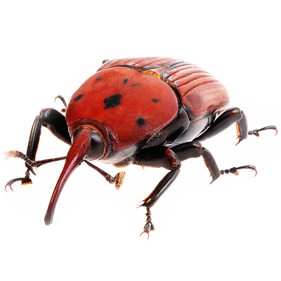 | 配套誘捕器 | 甲蟲誘捕器 | 昆蟲信息 | 紅棕象甲(Rhychophorus ferrugineus) 別名:棕櫚象、銹色棕櫚象、亞洲棕櫚象。體長(zhǎng)30-35mm,寬12mm左右,身體紅褐色,光亮或暗。頭部前端延伸成喙,雄蟲的喙粗短且直,喙背有一叢毛;雌蟲喙較細(xì)長(zhǎng)且彎曲,喙和頭部的長(zhǎng)度約為體長(zhǎng)的1/3。前胸前緣細(xì)小,向后緣逐漸寬大,略呈橢圓形;背上有6個(gè)小黑斑排列兩行,前排3個(gè),兩側(cè)的較小,中間的一個(gè)較大;后排3個(gè)較大。鞘翅較腹部短,腹末外露。身體腹面黑紅相間,各足基節(jié)和轉(zhuǎn)節(jié)黑色,各足腿節(jié)末端和脛節(jié)末端黑色,各足跗節(jié)黑褐色。觸角柄節(jié)和索節(jié)黑褐色,棒節(jié)紅褐色。 在中國(guó)海南、福建或廣東每年發(fā)生2-3代,世代重疊。一年中成蟲出現(xiàn)較集中時(shí)期為5月和11月,雌成蟲產(chǎn)卵于寄主葉腋間或樹干的傷口、樹皮的裂縫處。成蟲白天隱藏,夜間活動(dòng),不易捕捉。